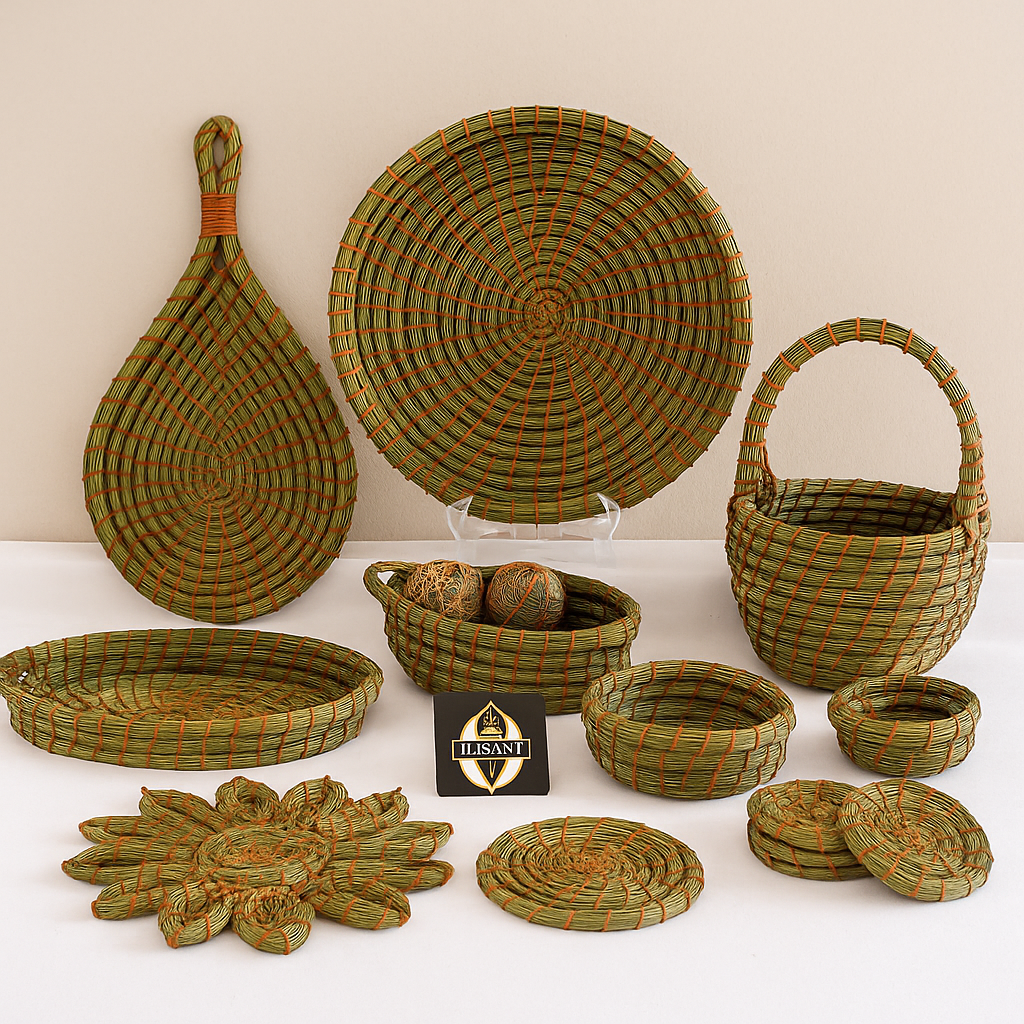 A set of handcrafted woven pine needle decorations.